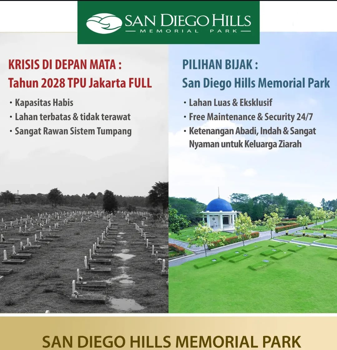 San Diego Hills Memorial Park Kondisi sejumlah lahan pemakaman di Jakarta sudah makin penuh. Dari 80 tempat pemakaman umum (TPU) yang tersebar di lima wilayah Jakarta, 69 di antaranya sudah penuh. Kondisi ini membuat sebagian besar TPU hanya melayani sistem pemakaman tumpang atau makam keluarga, sebuah metode yang memungkinkan jenazah baru dimakamkan di atas atau […]
