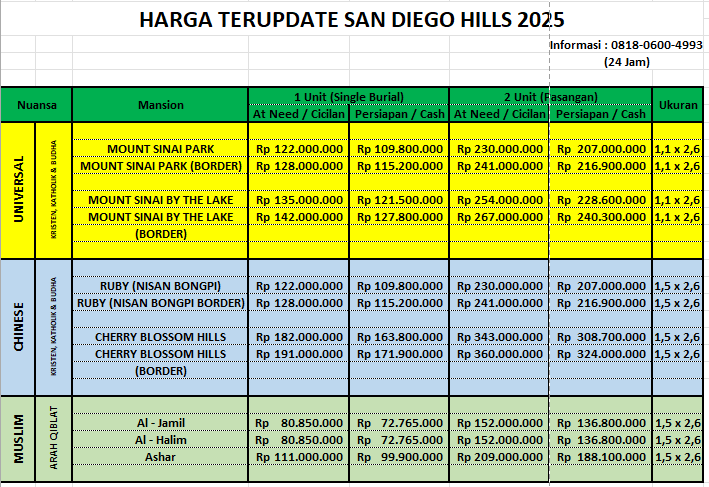 Harga setiap makam di San Diego Hills, termasuk Single Burial, bergantung pada skema pembelian yang Anda pilih: Pre Need atau At Need.